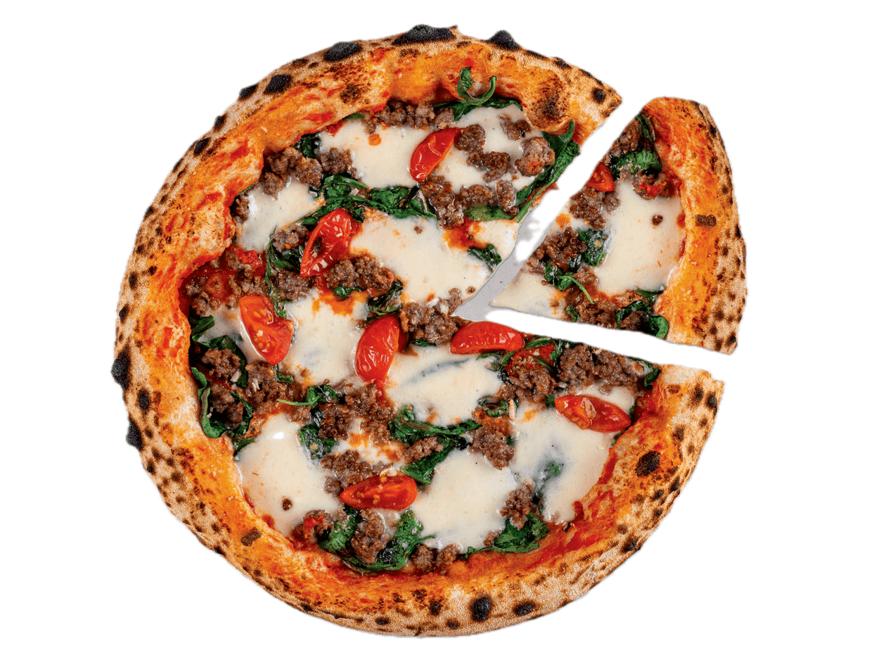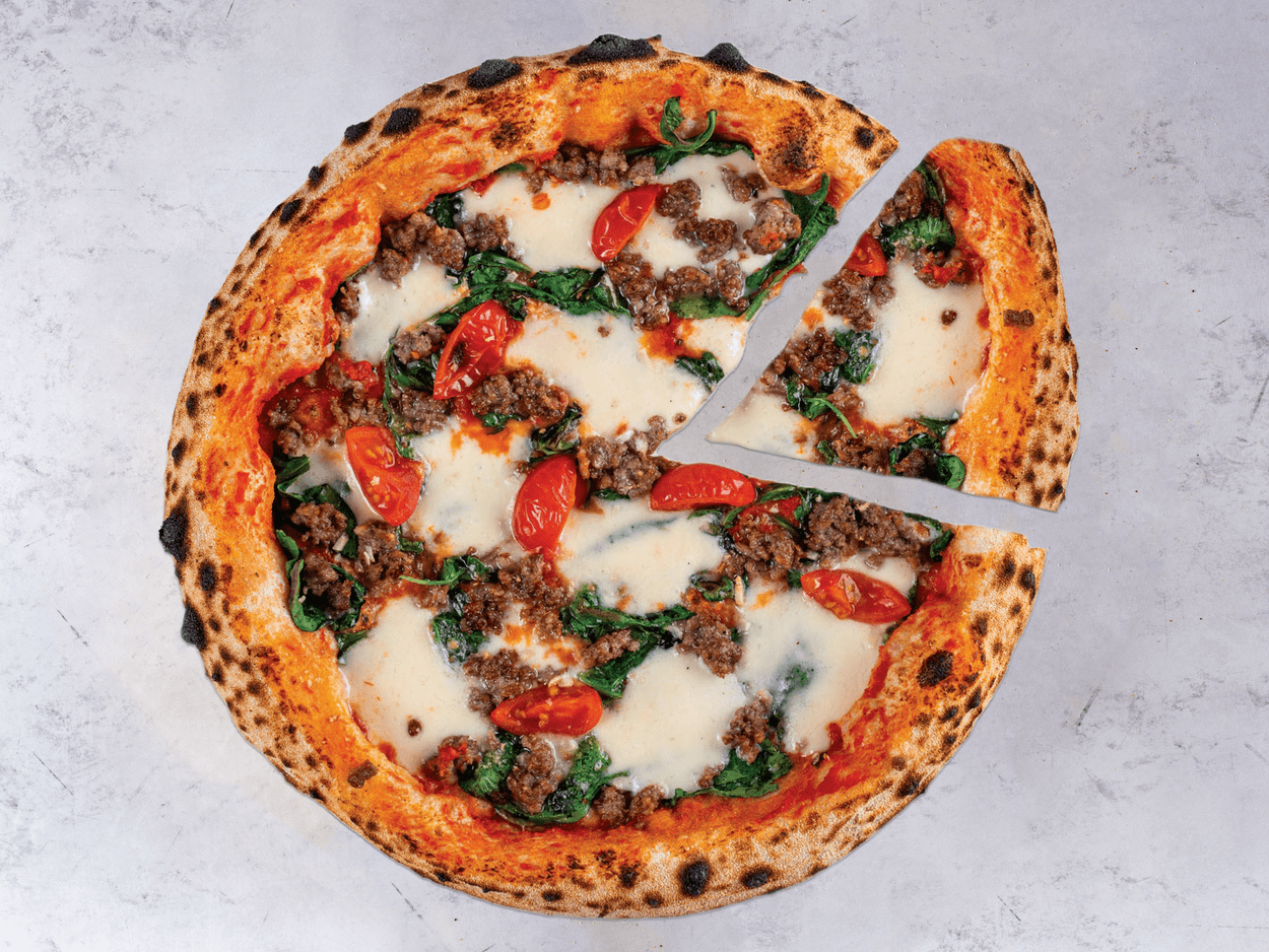 Blat artizanal cu făină Napoli, Sos din roșii San Marzano, Mozzarella Fior di latte, Parmezan, Salsiccia, Rosii Cherry, Spanac, Busuioc, Usturoi 600 g.