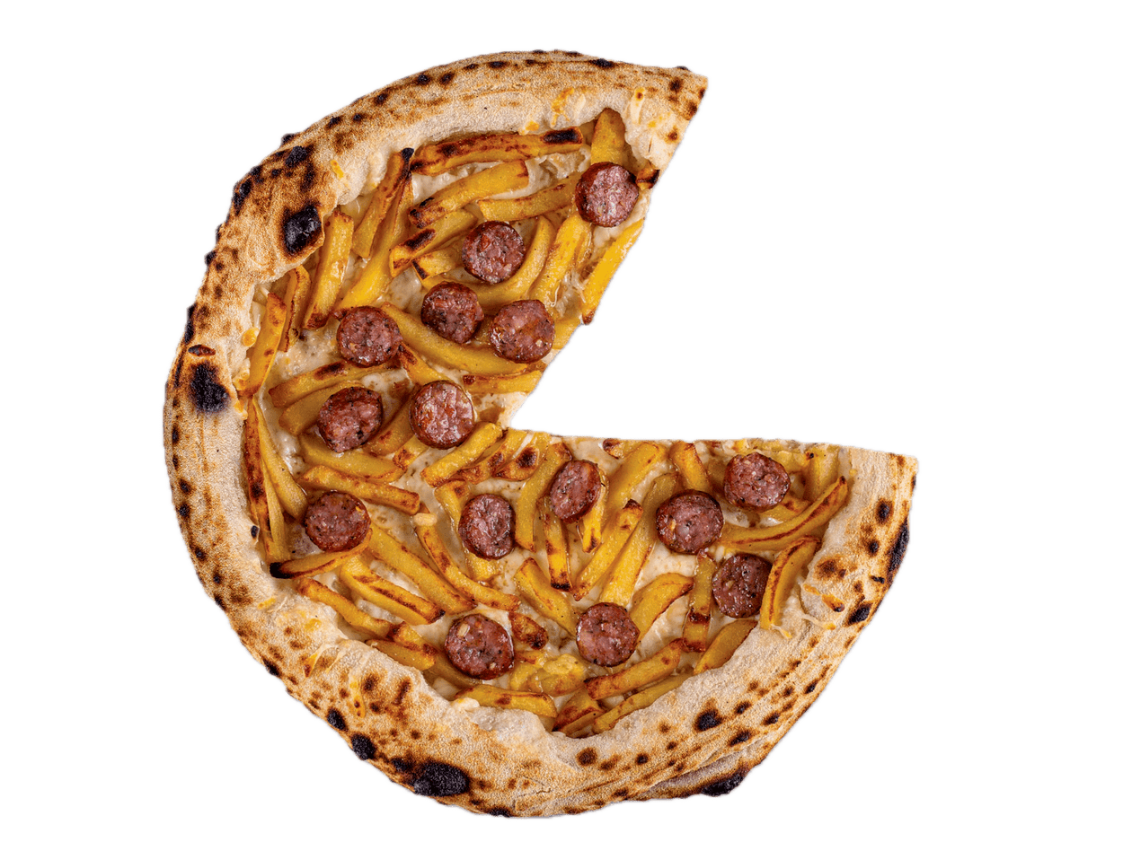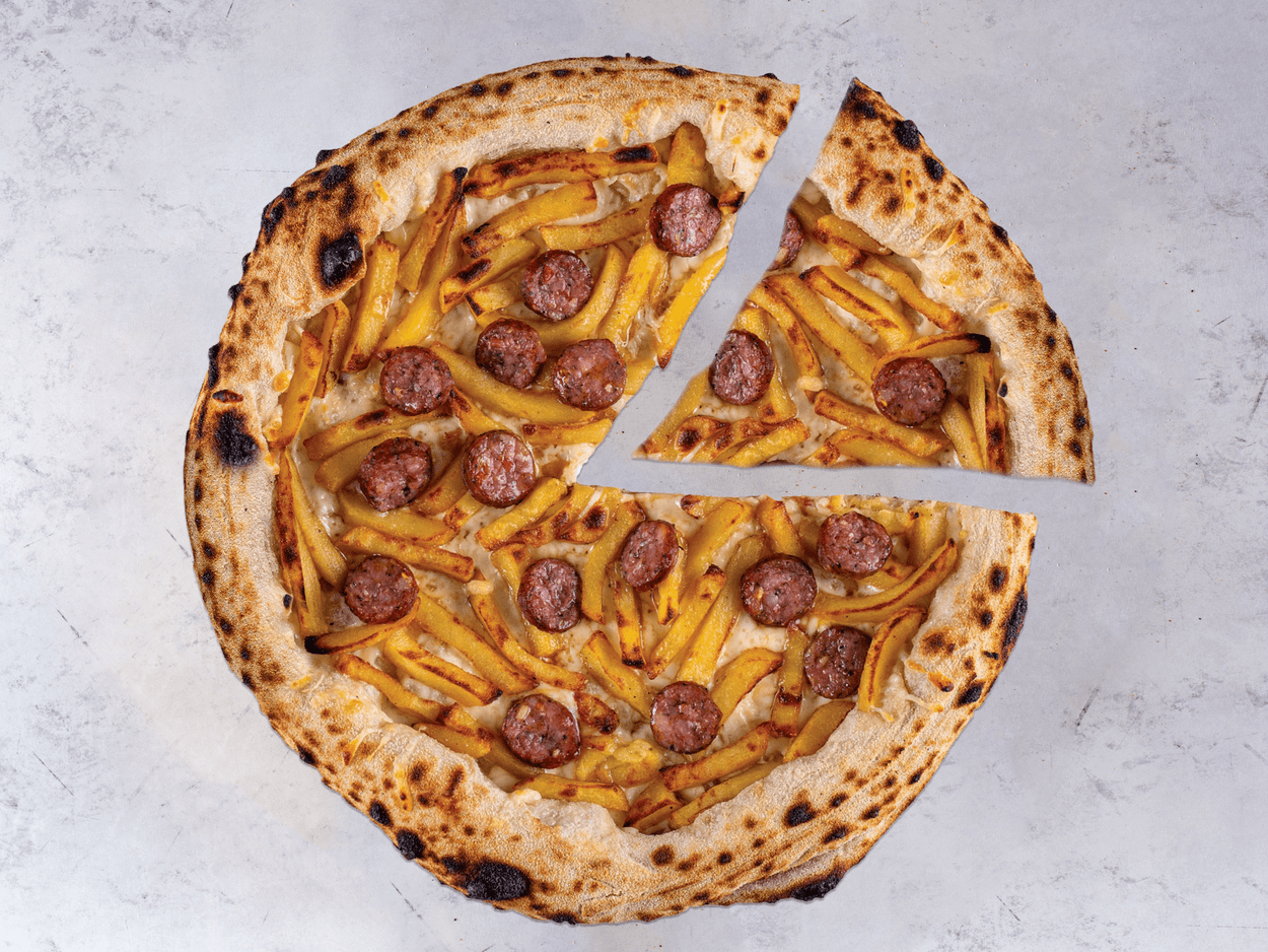 Blat artizanal cu făină Napoli, Cașcaval, Cartofi prăjiți (pai), Cârnați ardelenești 645 g.