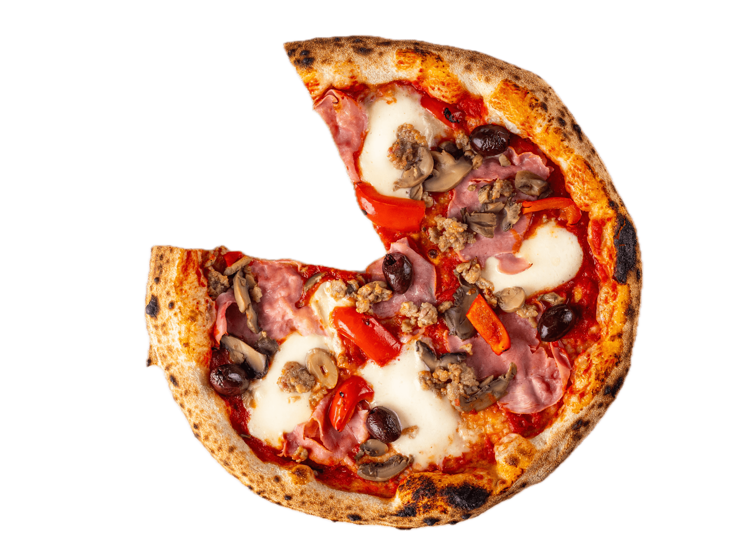 Pizza cu blat artizanal din făină Napoli, Sos din roșii San Marzano, Mozzarela Fior di latte, Ciuperci, Cârnați SALSICCIA, Măsline Kalamata, Ardei gras, Prosciuto COTTO BLU 600 g.