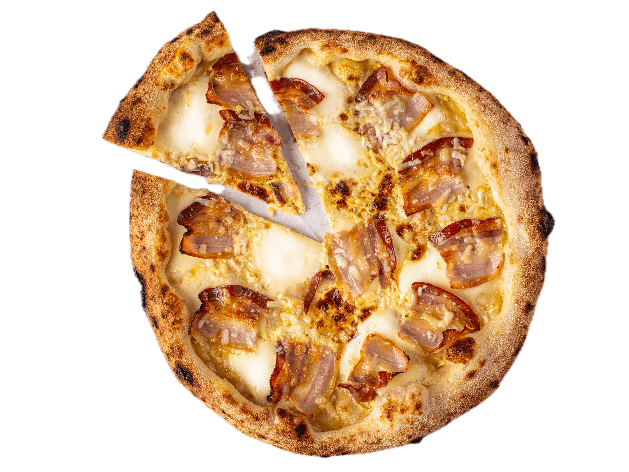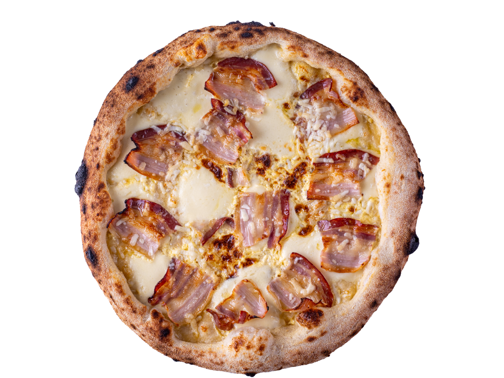 Pizza cu blat artizanal din faina Napoli, Mozzarela Fior di latte, Pancetta, Galbenus de ou, Piper, Ulei masline extravirgin 550 g.