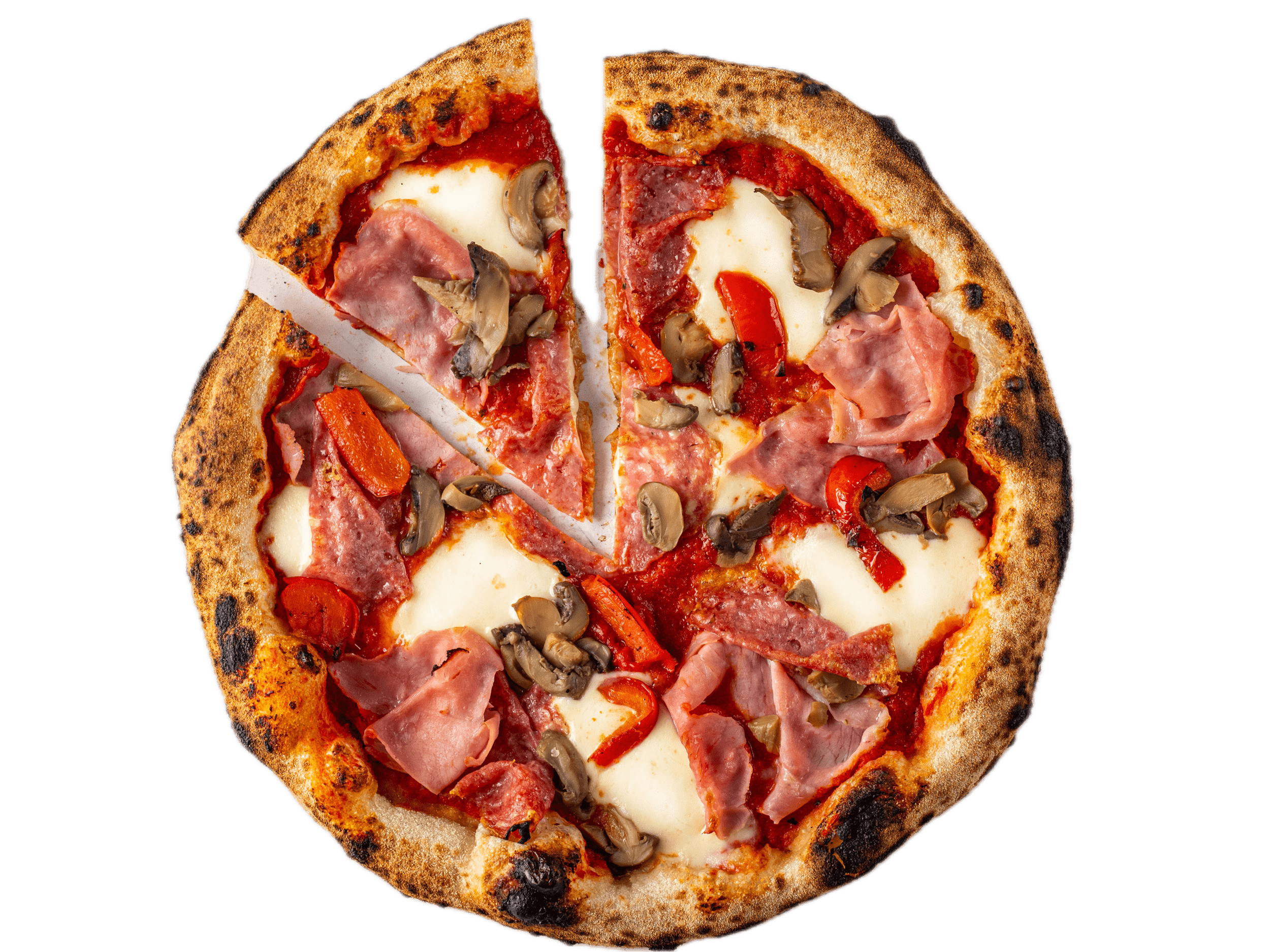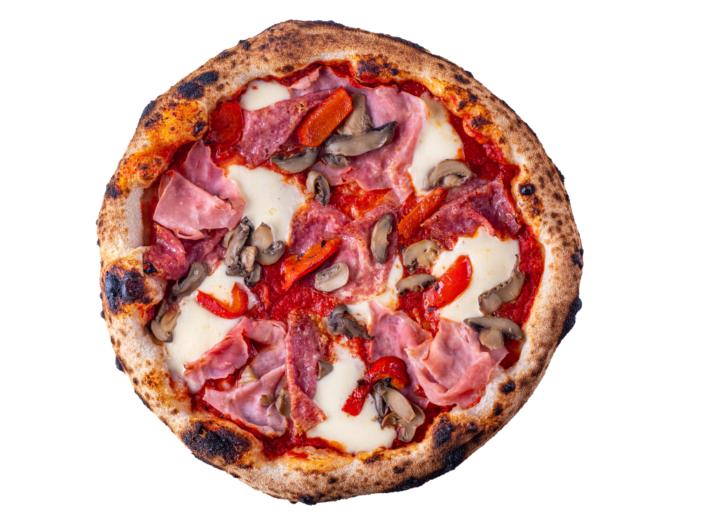 Pizza cu blat artizanal din făină Napoli, Sos din roșii San Marzano, Mozzarela Fior di latte, Prosciuto COTTO BLU, Salam nepicant Napoli, Ciuperci, Ardei gras 550 g.